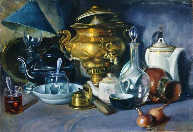 In my interest to provide a wide variety of artists and works, I searched long and far for this week's entry. The artist is Alexander V. Grigoriev (1891-1961), a Russian with a very interesting history. Although he made a huge impact on Russian art he is barely mentioned in a large book I own on Russian art. In the 1920's Grigoriev was an important member of the Socialist Realism Movement. He organized and lead several schools and art groups instructing and ministering to artists across the Soviet Union. In 1937 he was arrested for anti Soviet activities and spent the next nine years in a labor camp. From then on he was labeled an enemy of the people and was restricted from much travel, as he could not even go to Moscow to visit family. Finally in the mid 1950's his honor was reinstated in the Communist party and his achievements acknowledged.